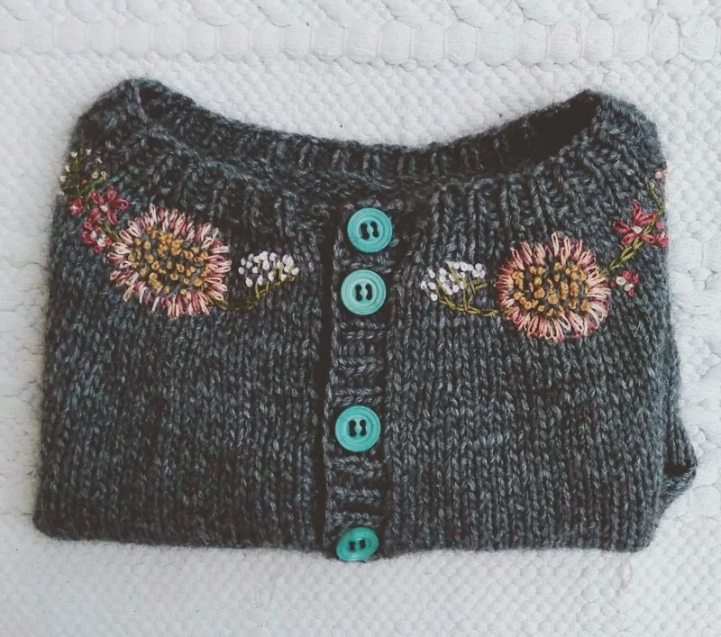 Above: Amore Cardigan in possum merino with embroidery, below: Elizabeth Zimmerman’s Baby Surprise Jacket in handspun merino