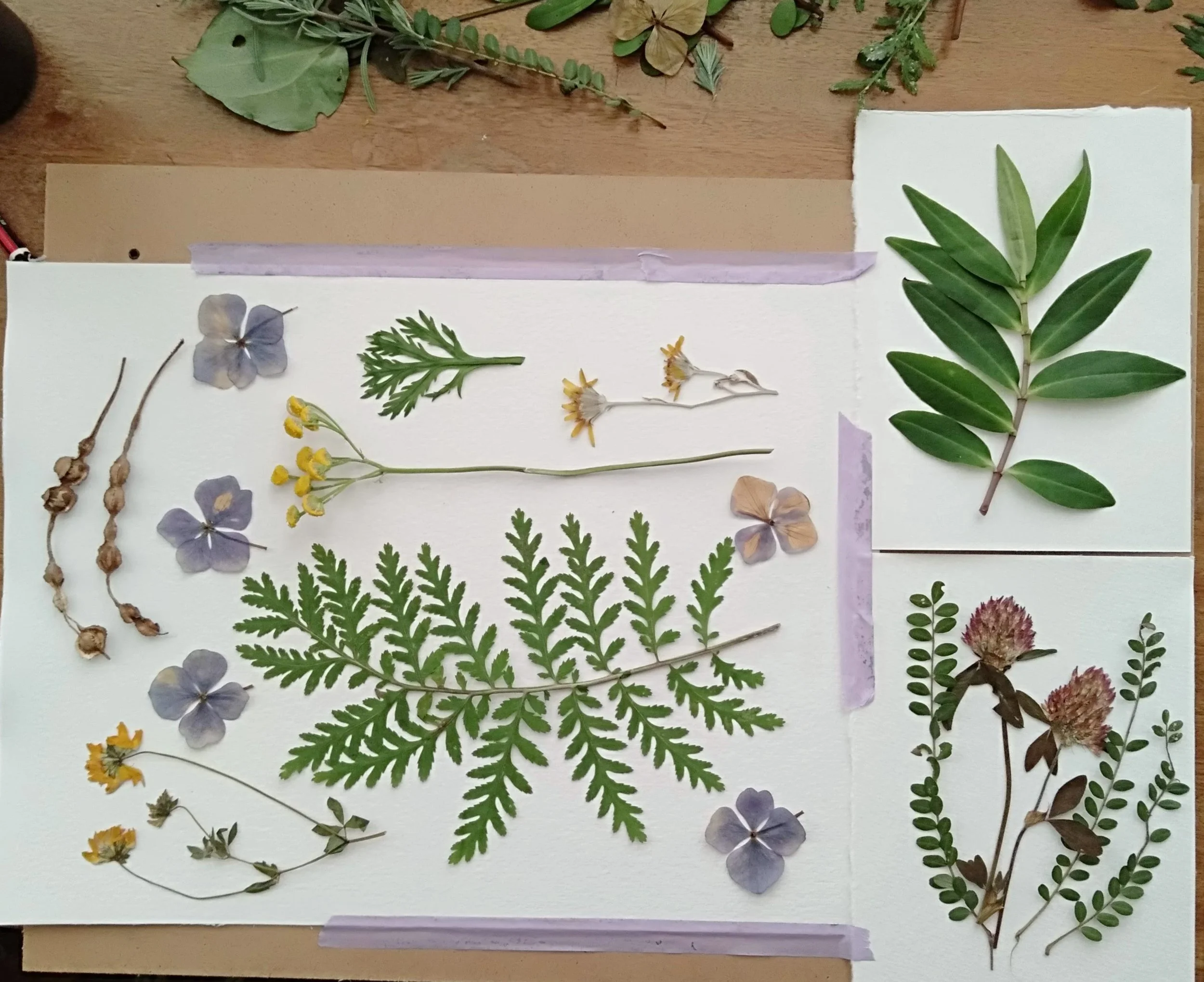 Laying out fresh plant matter, including kowhai pods and hebe leaves ready for printing