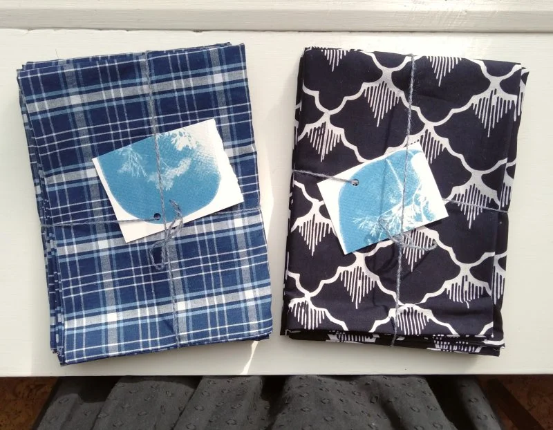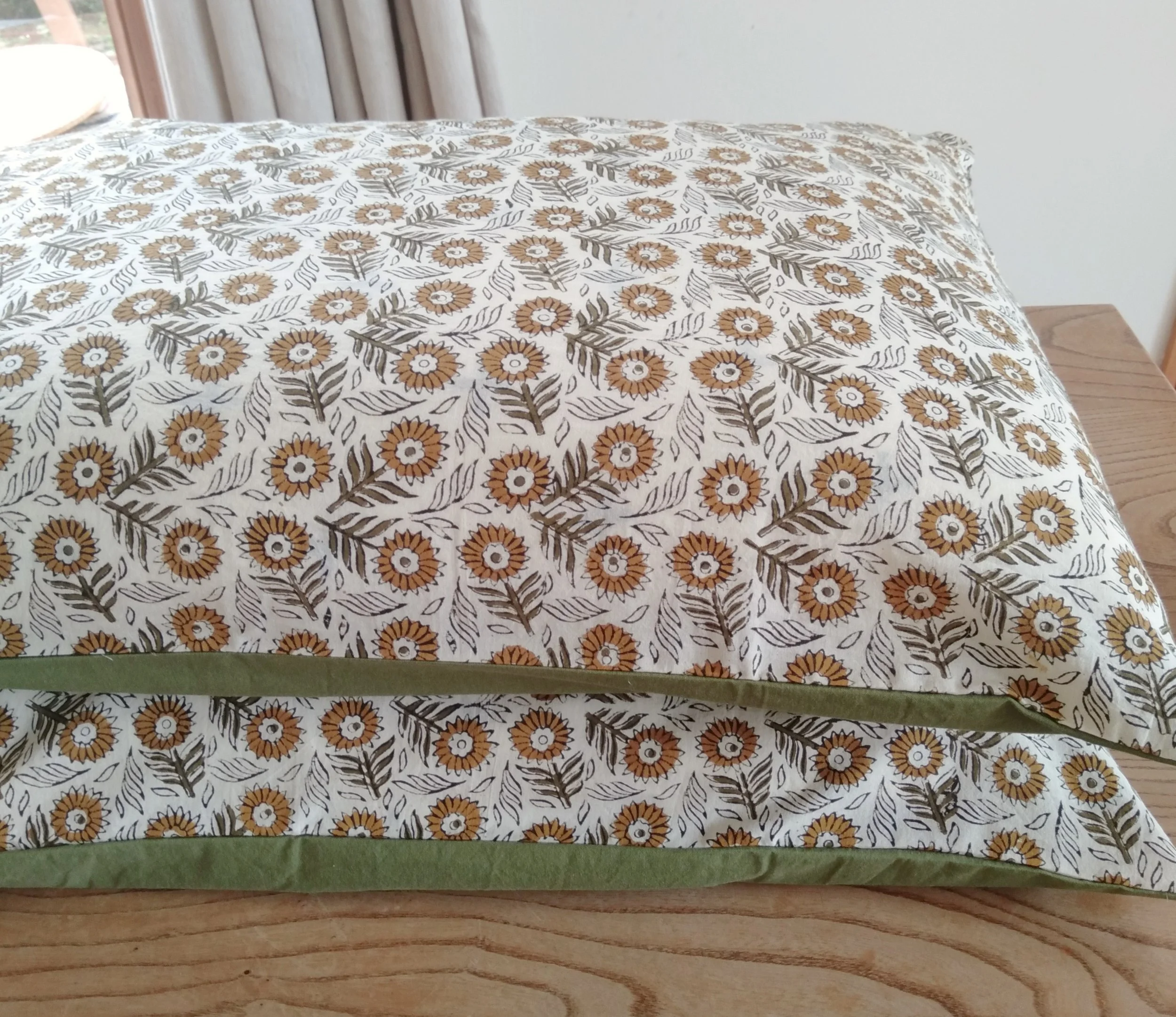 I made the sunflower pair at the top of this page using this method, because I only had 1 metre of the block-printed fabric and wanted to showcase it. I used some green cotton for the back of the cases. The same method was used for the two pairs shown below, which were both made from precious Nani Iro cotton gauze.