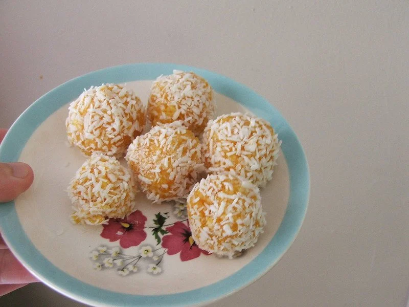 Place all of the ingredients (except extra coconut for rolling) in a food processor and blitz until a firm paste. Remove and roll mixture into small balls. Roll in extra coconut and place in the fridge to firm up.