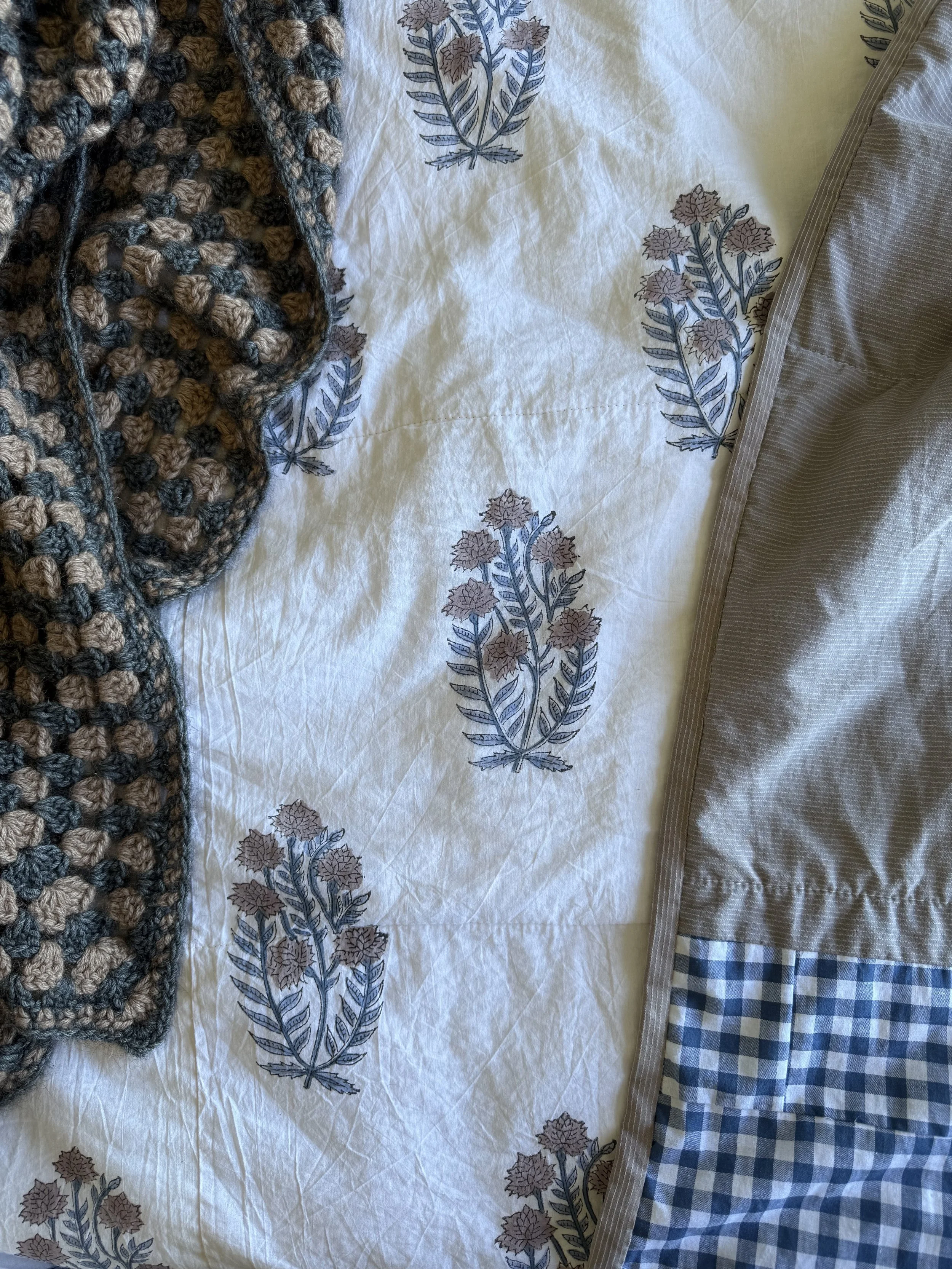Another project I loved working on recently is a light summer quilt I made for our bed. I used a beautiful piece of Jaipuri hand block-printed cotton I ordered online from this store back in the depths of winter. I was dreaming of a lightweight quilt of some sort, and when it arrived, I knew it would be perfect. I pieced together some leftover cottons for the back of the quilt, and did the same to create the bindings. I used a lightweight cotton batting inside.
