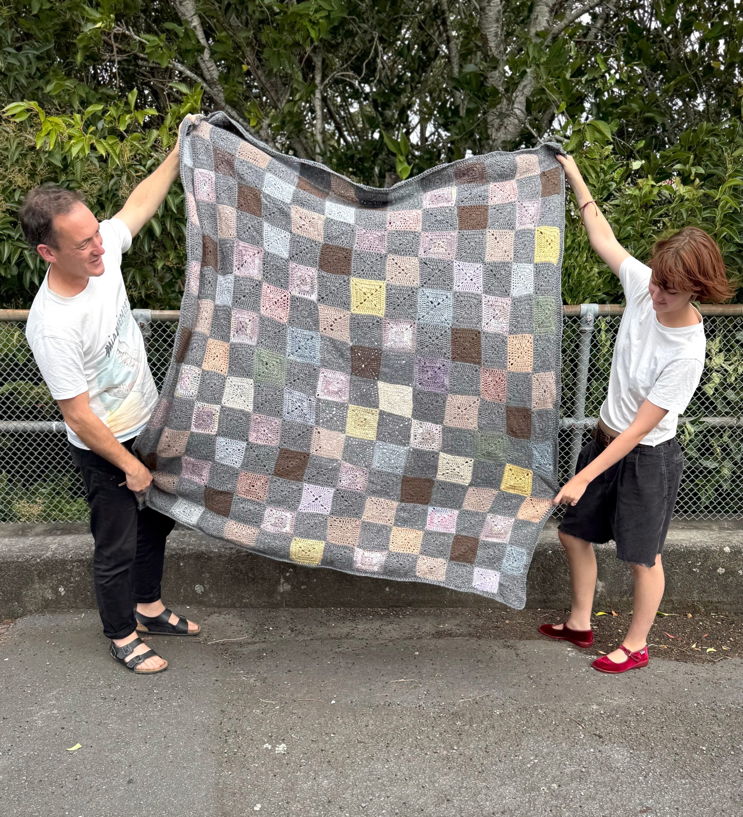 With a starting point of a basket of beautiful handspun and handdyed yarn from my mum, and some lightweight possum-merino yarn (this one, from Loopine in Auckland), I used the Battenberg Blanket pattern by Sandra Paul, which comes with lots of great video tutorials and photos. I highly recommend it, especially if, like me, you’re not a super-experienced crocheter. The original version is made up in cream and bright colours, to evoke a sweet battenberg cake. I made my squares a bit larger and also looser in gauge, as I wanted to avoid a dense or heavy fabric.